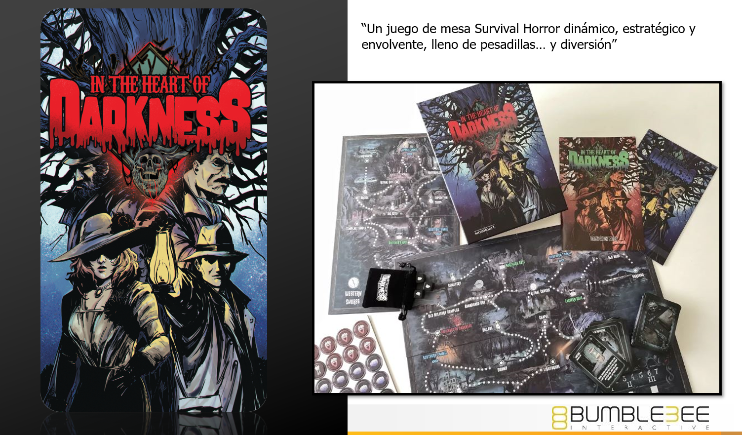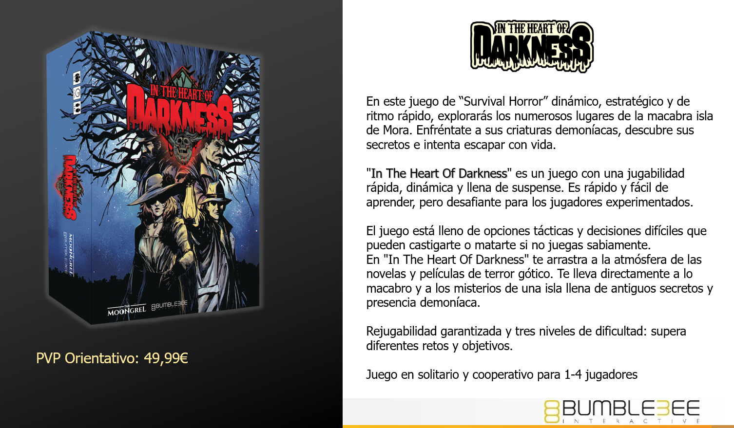 En In the Heart of Darkness, el horror acecha en cada sombra, susurrando secretos prohibidos en los oscuros rincones de la isla de Mora. Hace un año, Cornelius Raessler huyó de su mina abandonada tras una serie de sucesos inexplicables… pero el destino lo arrastró de vuelta. Ahora, tú y tu equipo debéis explorar la isla maldita, enfrentaros a horrores innombrables y, con suerte, escapar con vida. Pero cuidado, pues cada paso puede ser el último y la locura es un enemigo tan implacable como las criaturas que acechan en la penumbra. Con un sistema de survival horror estratégico y dinámico, este juego cooperativo para hasta cuatro jugadores (o en solitario, si te atreves) te desafía a mantener la cordura mientras te abres paso en la negrura. ¿Podrás desentrañar los secretos de Mora… o serás solo otro lamento en la brisa?