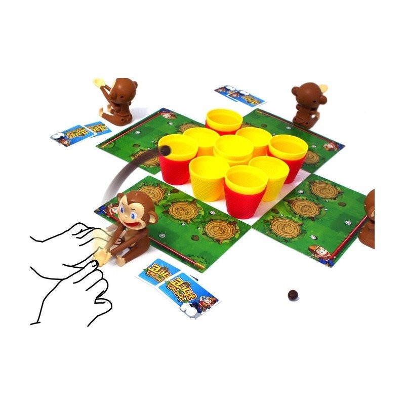 Contenido: 4 monos lanzadores, cocos saltarines, cestas, tableros de jugador, cartas mágicas y todo lo necesario para una batalla legendaria llena de risas y puntería.
