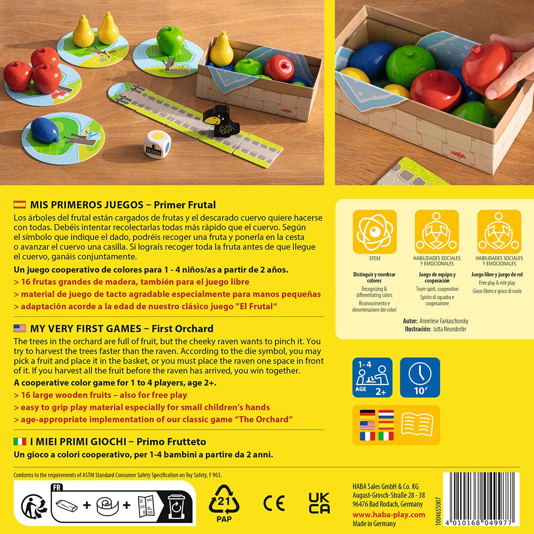 En Primer Frutal, la cosecha peligra por culpa del travieso Cuervo Teo. Trabajad en equipo para recolectar todas las frutas antes de que el ladronzuelo llegue al huerto. Tirad el dado, recoged frutas y detened al astuto cuervo. ¡Un juego cooperativo perfecto para los más pequeños con piezas de madera grandes y coloridas!