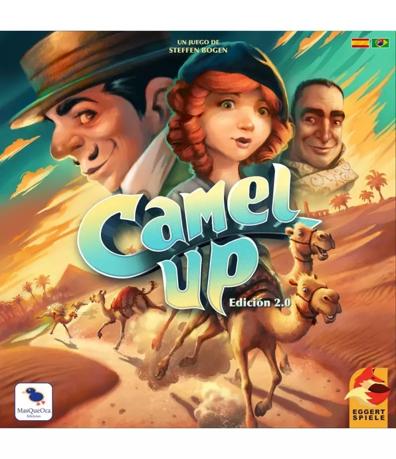 ¡Estos camellos lo tienen fácil corriendo a la sombra de una enorme palmera en 3D! Camel Up, el laureado juego de carreras de camellos que ha ganado innumerables premios ¡vuelve más loco que nunca! Nuevos corredores han aparecido desde tu última visita a la pista ¡unos camellos locos que corren en la dirección opuesta! Pero eso no es todo, en esta nueva versión se han añadido nuevos componentes y mejorado los demás, y el arte del juego ha sido completamente renovado. Sé testigo de la carrera de Camellos más alocada de todos los tiempos, dónde las cosas funcionan al revés cuando los Camellos se montan unos encima de otros y las Pirámides se dan la vuelta. Como miembro de la alta sociedad egipcia, os reunís en el Desierto con un claro objetivo: ganar la mayor cantidad de dinero posible apoyando al Camello que crees que ganará cada Etapa y al que ganará la carrera completa. Sin embargo, en esta carrera, también puedes ganar dinero deduciendo que Camello llegará el último. La lectura dinámica de la carrera y marcar los tiempos es muy importante para apostar por el Camello correcto y alzarte con la victoria. Camel Up es un juego familiar para 2 a 8 jugadores, sencillo, rápido y escandalosamente emocionante. Al acabar cada partida de aproximadamente 30 minutos de duración, no podrás resistirte y volverás a retar a tus compañeros de juego para dilucidar nuevamente al ganador. Esta nueva versión mejorada del juego incluye una pirámide de plástico muy resistente, un tablero precioso con una palmera en 3 dimensiones que te hará sumergirte de lleno en esta carrera por el desierto y nuevas reglas, como los 2 camellos corredores que se han equivocado de dirección y están corriendo en la dirección opuesta, estorbando a los demás. 👥 2-8 jugadores ⏳ 30 min 🎂 8+ años