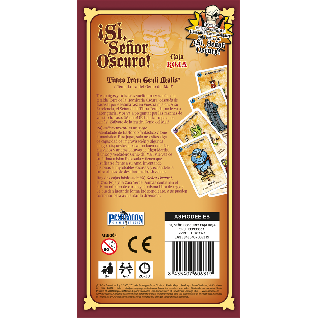 En ¡Sí, Señor Oscuro! Caja Roja la temida Torre de la Hechicería Oscura vuelve a ser testigo de vuestros desastrosos intentos y excusas sin sentido. Tras fracasar por enésima vez en vuestra misión, el Genio del Mal, soberano de la Tierra Perdida, os espera con furia. ¡Mentirosos y astutos, echad la culpa a vuestros compañeros y salvad vuestra piel de la ira de vuestro amo! Este juego humorístico y desenfadado, donde la improvisación es la clave, os reta a inventar las excusas más absurdas mientras las cartas de Excusa, Acción y Mirada Fulminante os ayudan a sortear el destino. ¡Alza vuestra copa y burlad al destino en cada partida!