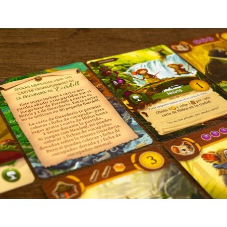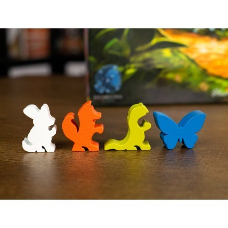 Componentes: 1 reglamento, 1 tablero central, 4 tableros de hogar, 4 dados de recursos, 1 dado de 8 caras, 12 figuras de amigos (mariposas, zorros, lagartos y ratones), 60 cartas, bayas, ramitas, resina y muchas losetas más.